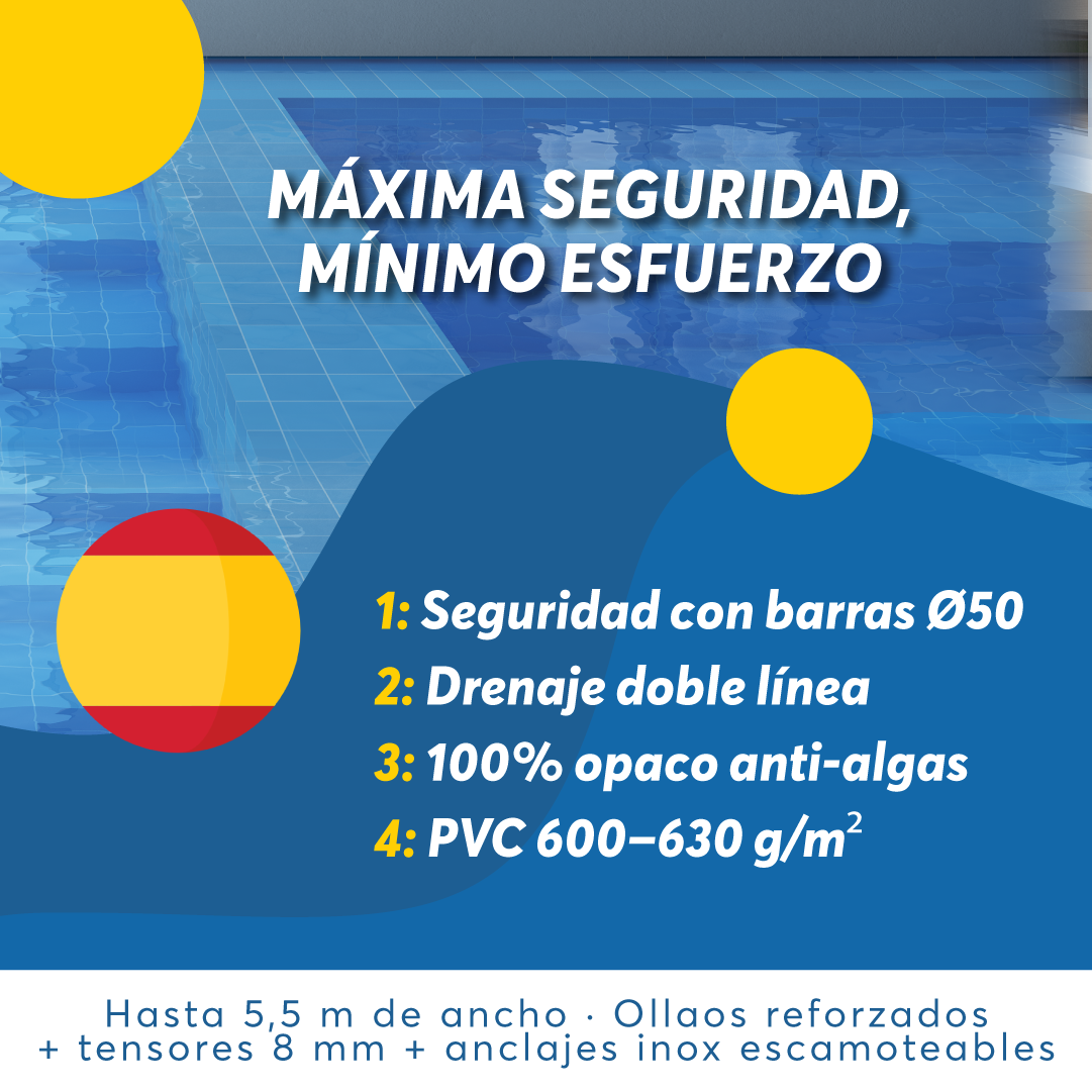 El Cobertor Dúo es un modelo híbrido que combina lo mejor de un cobertor de barras y uno de anclajes. Cuenta con dos barras de aluminio en los extremos, lo que aporta un soporte firme y facilita tanto su colocación como su recogida, ideal para piscinas de uso ocasional o de “fin de semana”.