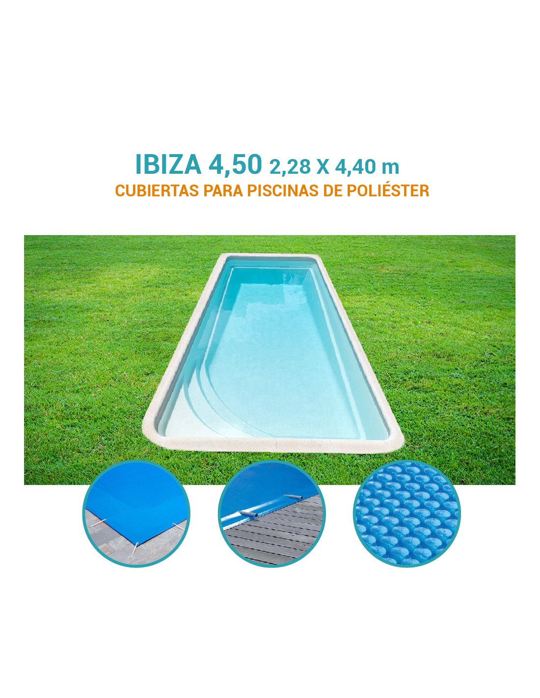 En Piscihogar fabricamos a medida diferentes cubiertas para la piscina de poliéster Ibiza de 4,40 x 2.28m, fabricada por DTP Nuestras soluciones permiten mantener tu piscina en perfecto estado durante todo el año: