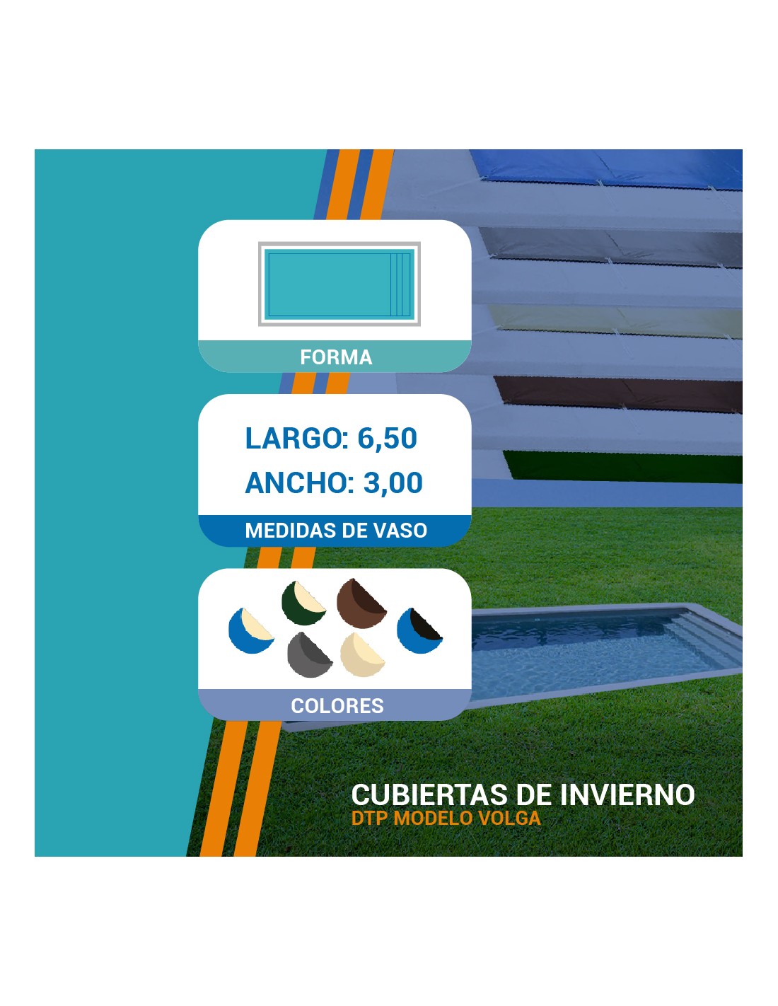 En Piscihogar fabricamos a medida diferentes cubiertas para la piscina de poliéster Volga 6,50 de 6,50 x 3m, fabricada por DTP. Nuestras soluciones permiten mantener tu piscina en perfecto estado durante todo el año: