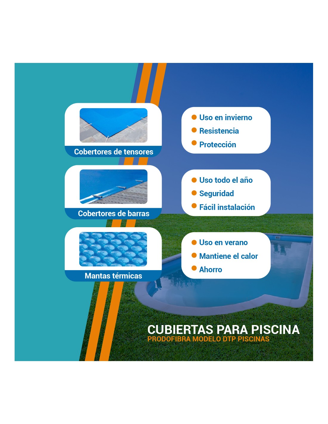 Manta térmica de verano: se coloca sobre la superficie con las burbujas hacia abajo, ayuda a conservar la temperatura que aporta el sol, reduce la evaporación y el consumo de productos químicos, además de impedir la caída de suciedad al agua.