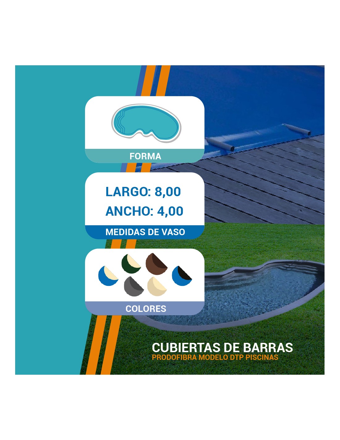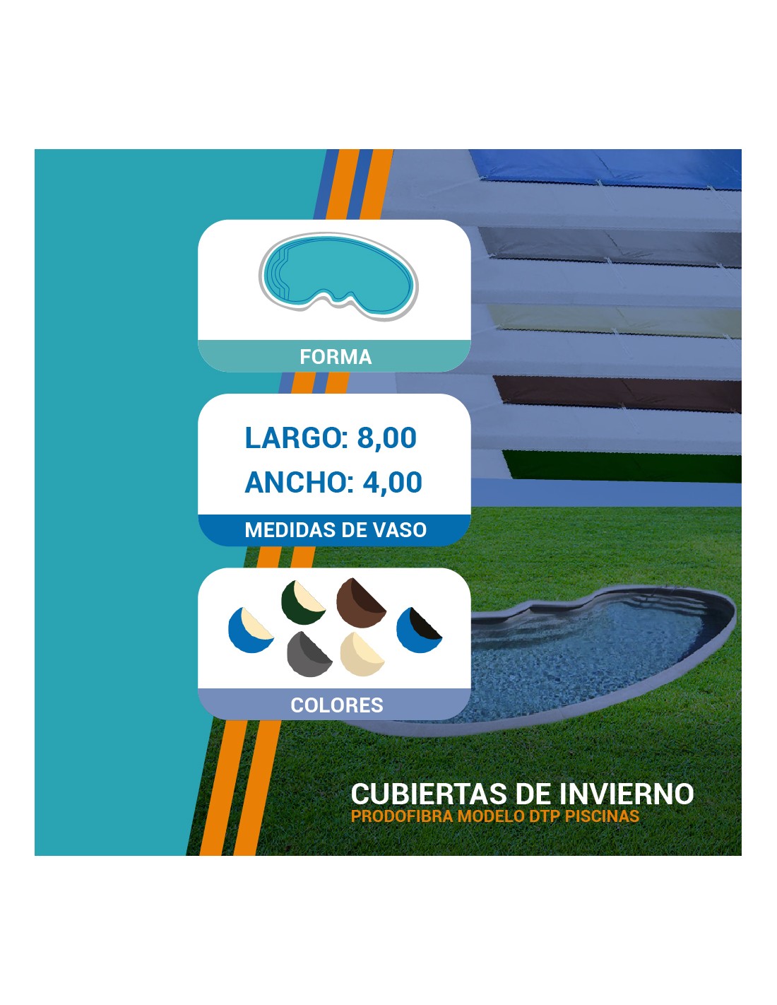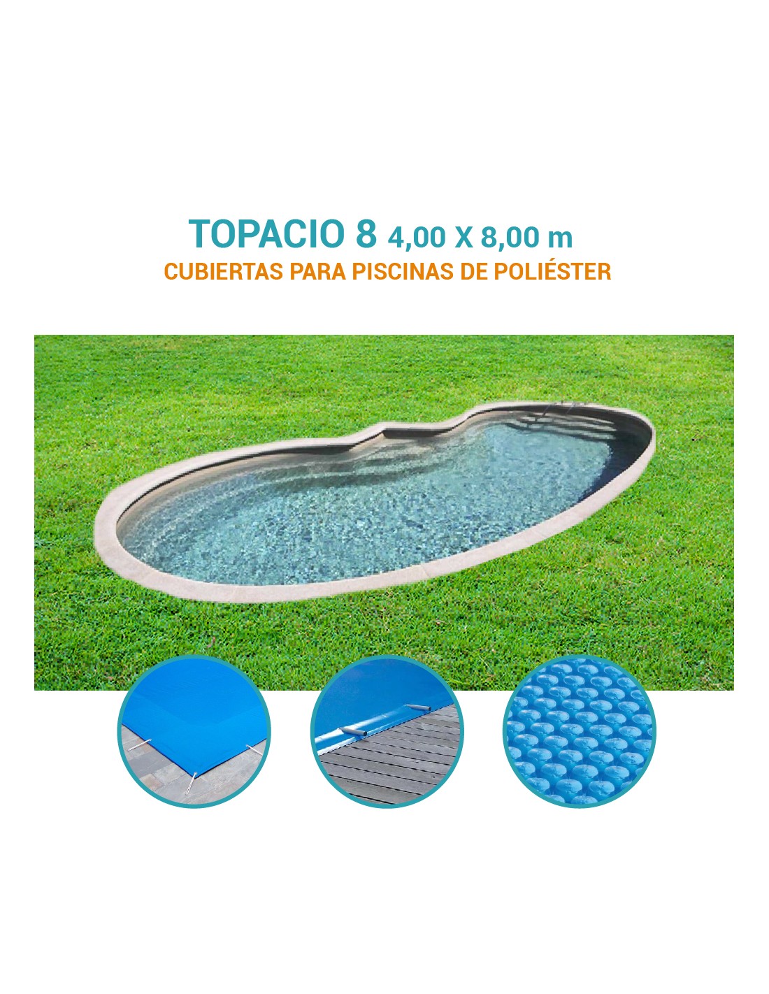 En Piscihogar fabricamos a medida diferentes cubiertas para la piscina de poliéster Topacio 8 de 8 x 4m, fabricada por DTP. Nuestras soluciones permiten mantener tu piscina en perfecto estado durante todo el año: