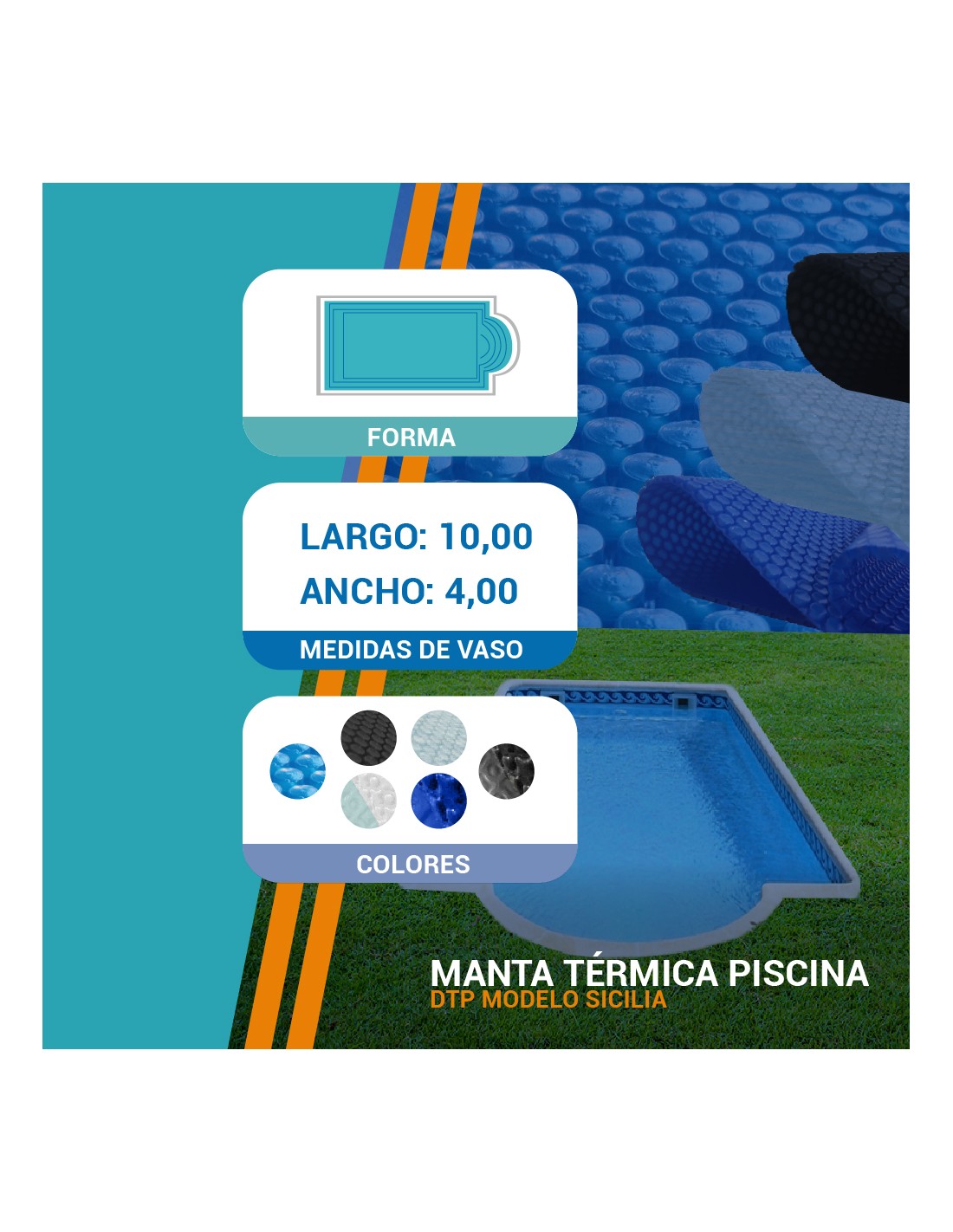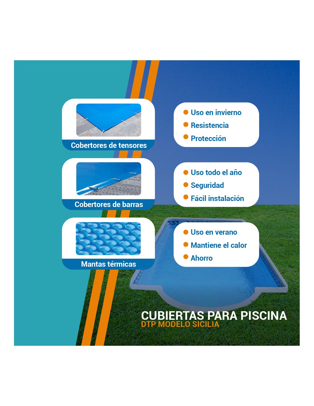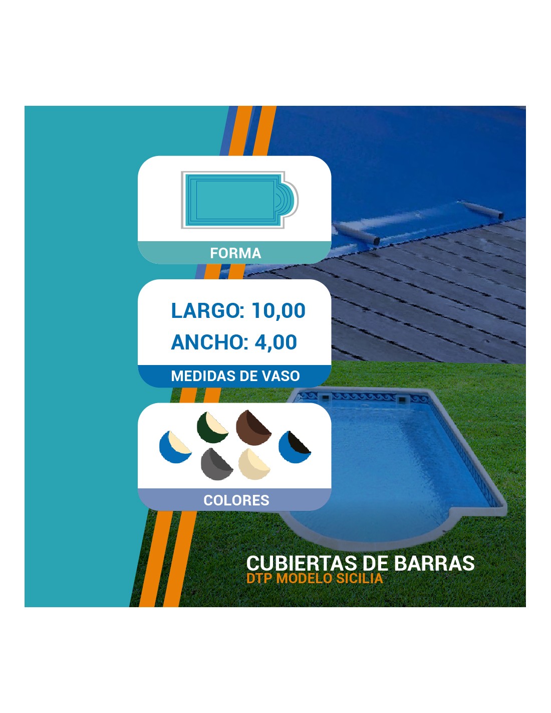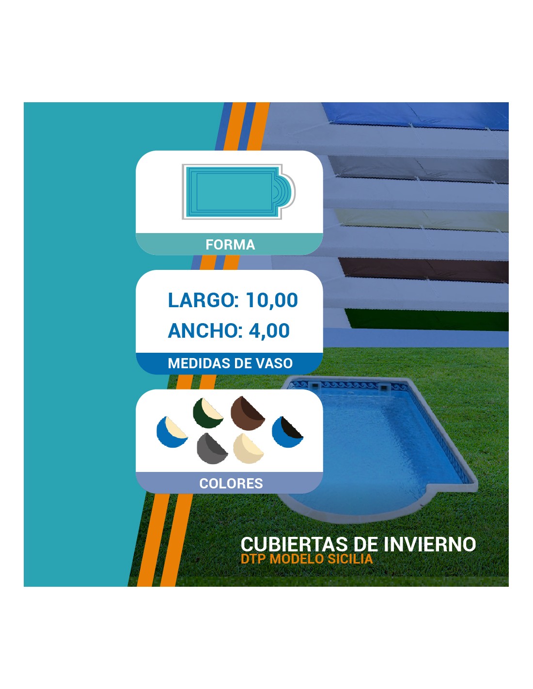En Piscihogar fabricamos a medida diferentes cubiertas para la piscina de poliéster Sicilia 10 de 10 x 4m, fabricada por DTP. Nuestras soluciones permiten mantener tu piscina en perfecto estado durante todo el año: