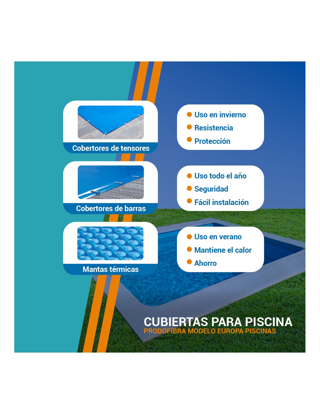 Manta térmica de verano: se coloca sobre la superficie con las burbujas hacia abajo, ayuda a conservar la temperatura que aporta el sol, reduce la evaporación y el consumo de productos químicos, además de impedir la caída de suciedad al agua.