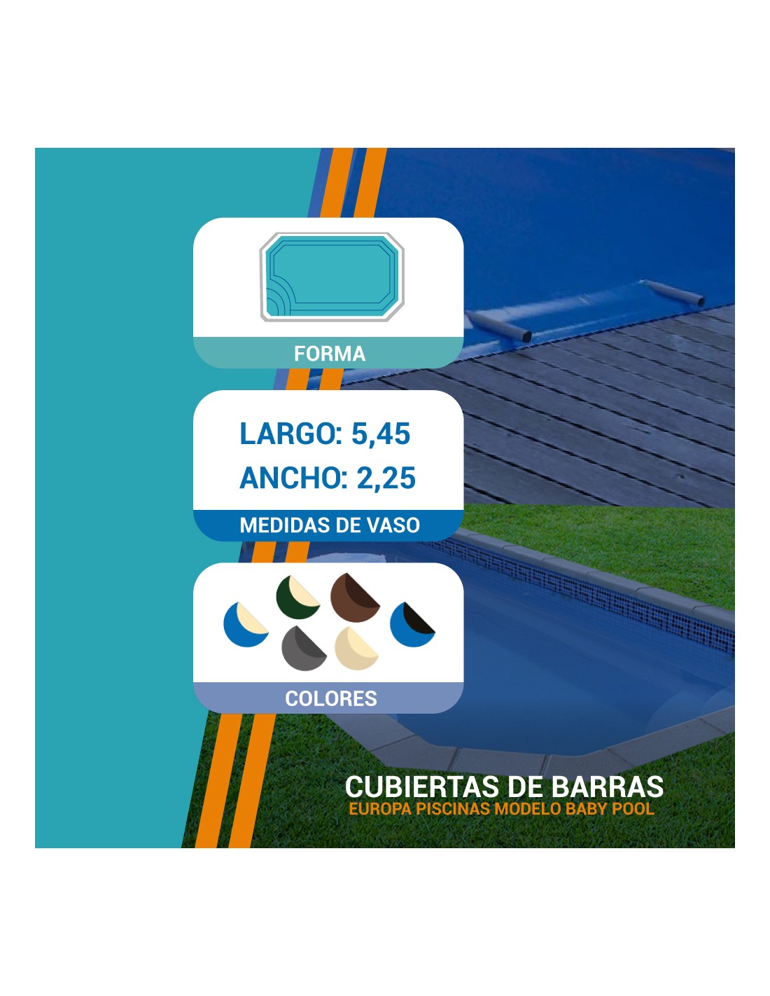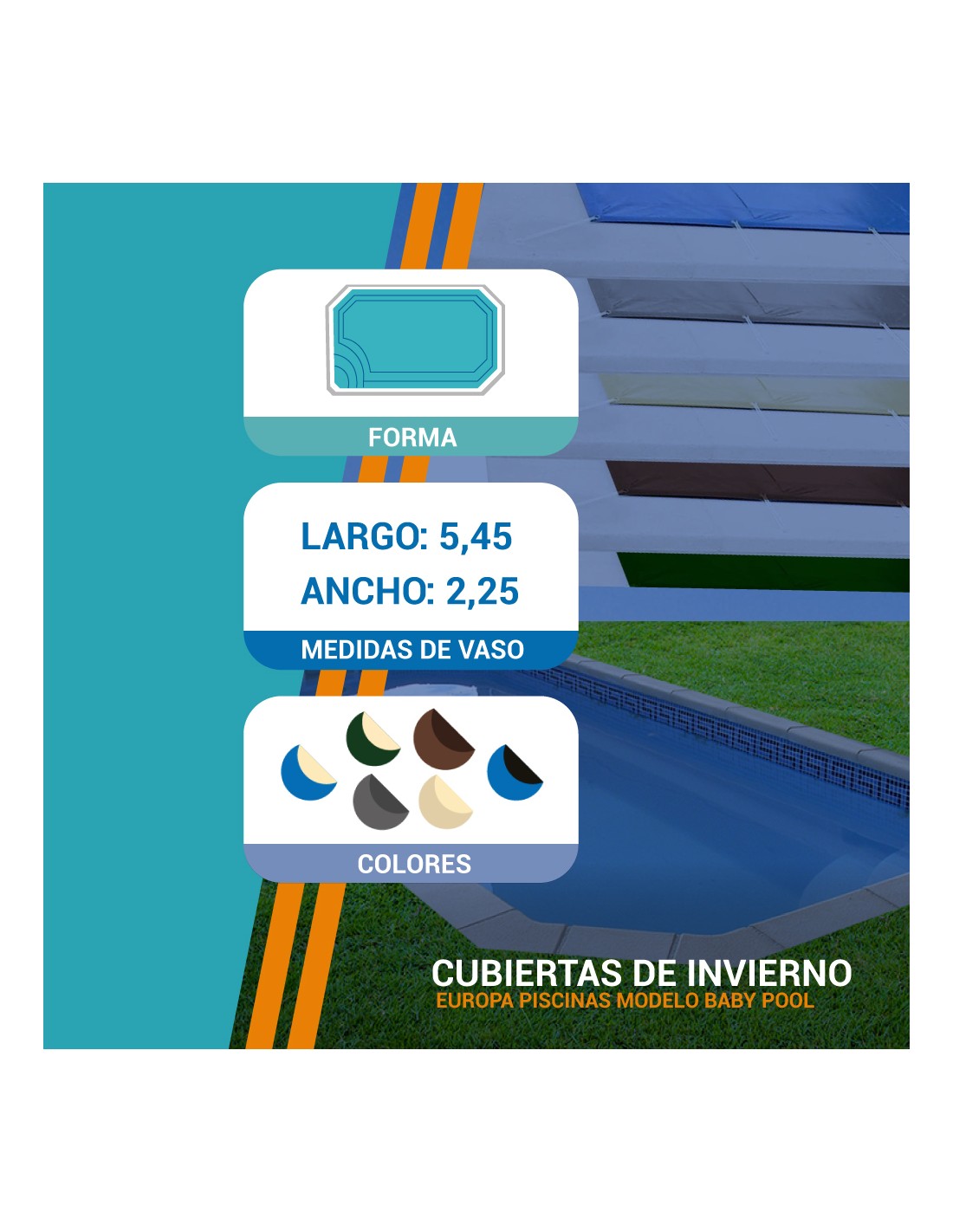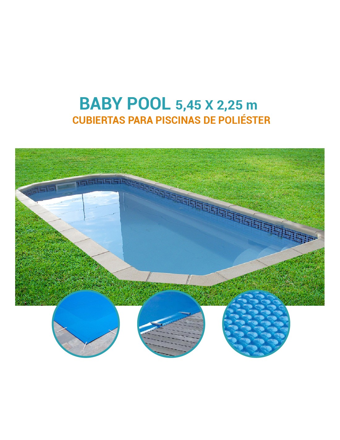 En Piscihogar fabricamos a medida diferentes cubiertas para la piscina de poliéster Baby pool de 5,45x2,25 m, fabricada por Europa Piscinas. Nuestras soluciones permiten mantener tu piscina en perfecto estado durante todo el año: