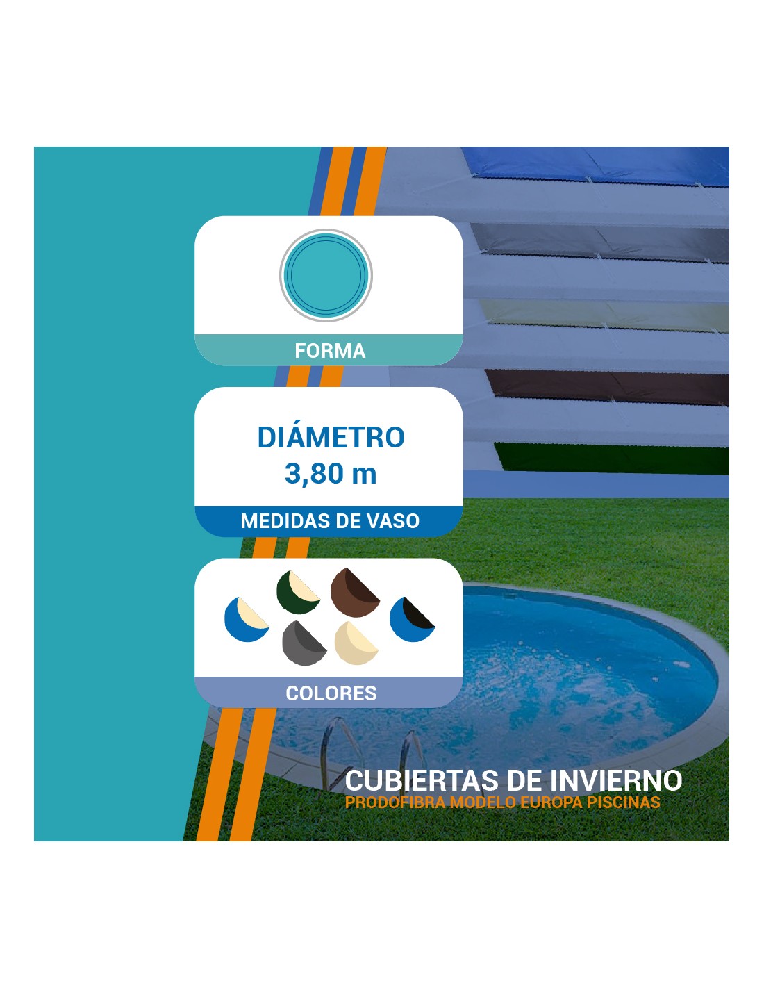 En Piscihogar fabricamos a medida diferentes cubiertas para la piscina de poliéster Mónaco de 3,80 m, fabricada por Europa Piscinas. Nuestras soluciones permiten mantener tu piscina en perfecto estado durante todo el año:
