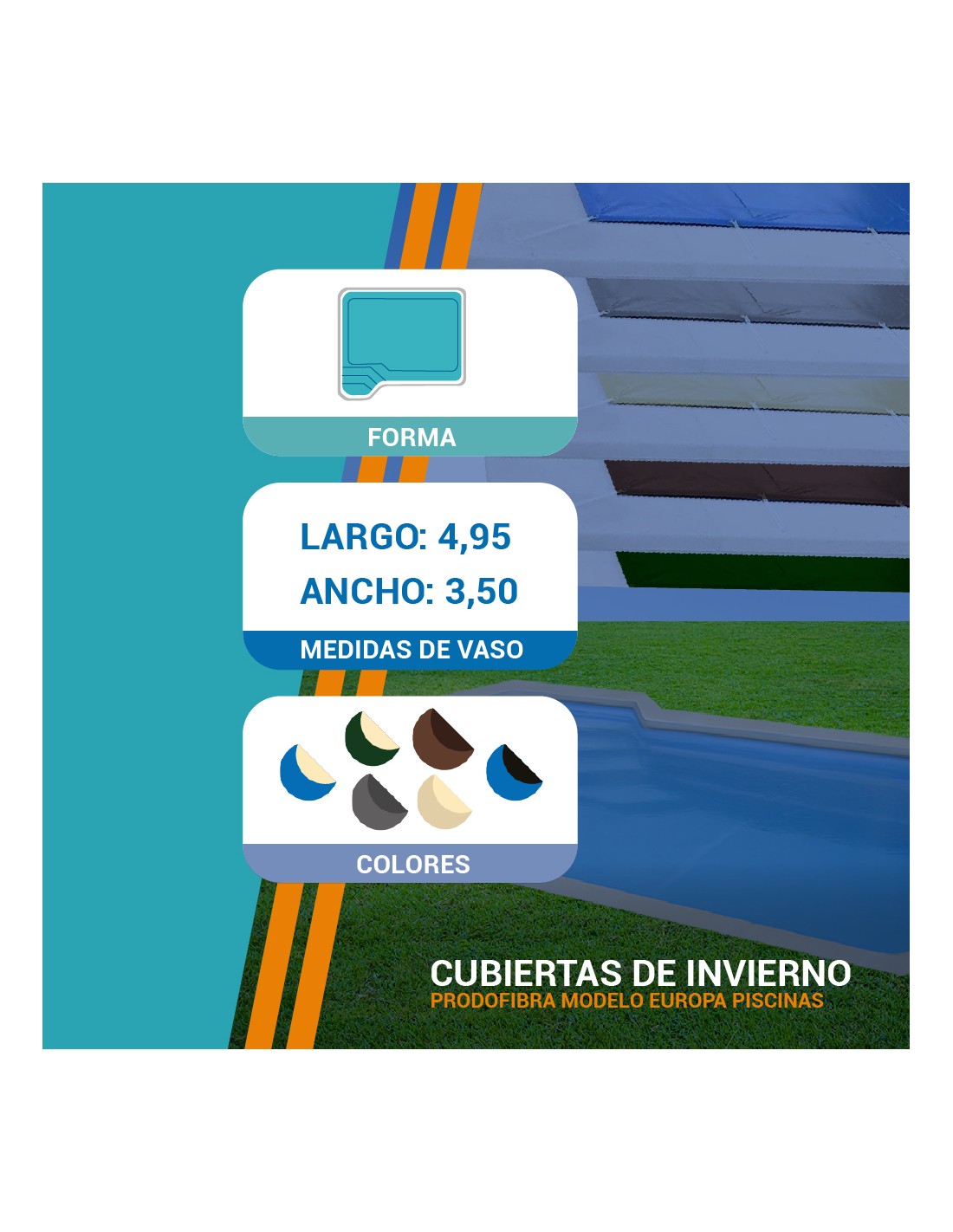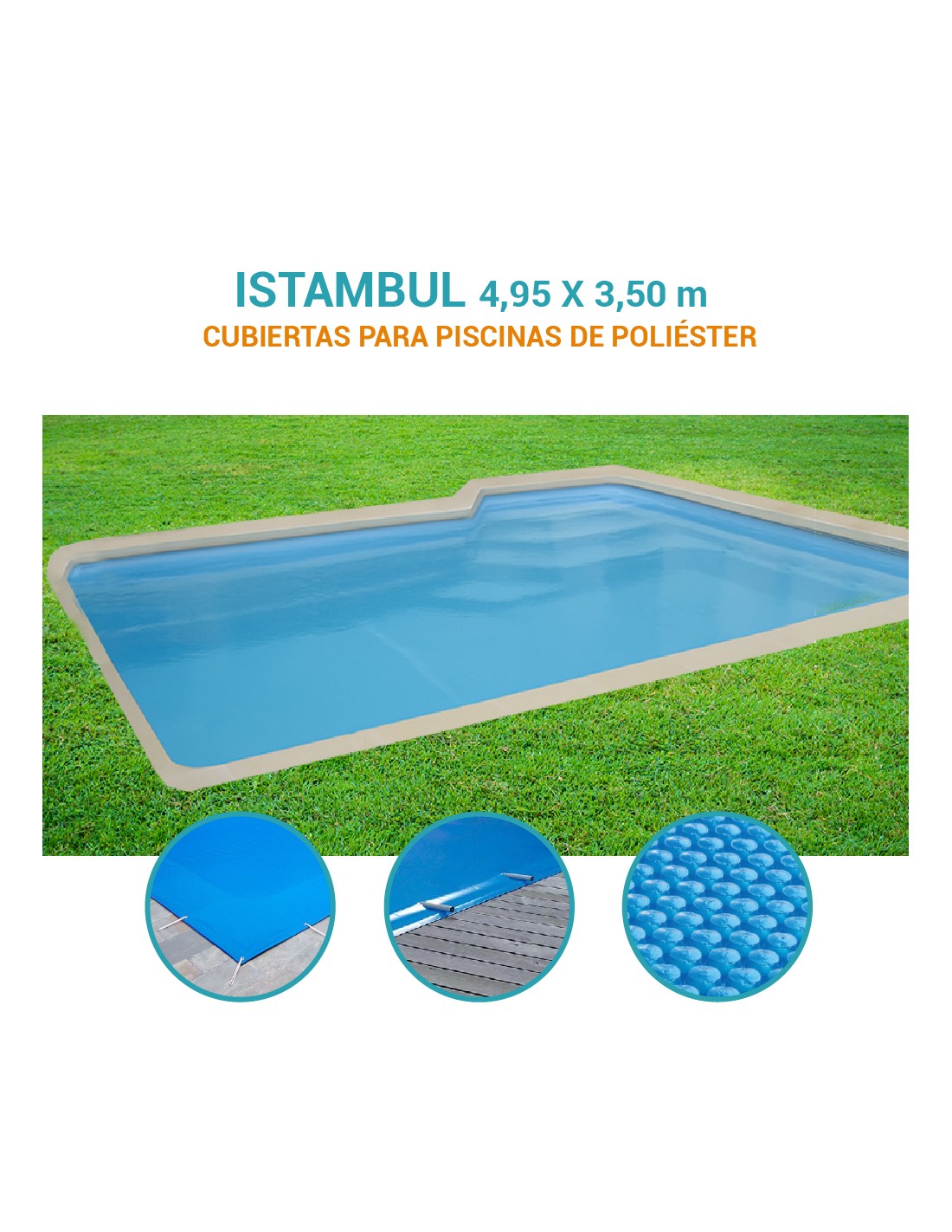En Piscihogar fabricamos a medida diferentes cubiertas para la piscina de poliéster Istambul de 4,95x3,50 m, fabricada por Europa Piscinas. Nuestras soluciones permiten mantener tu piscina en perfecto estado durante todo el año: