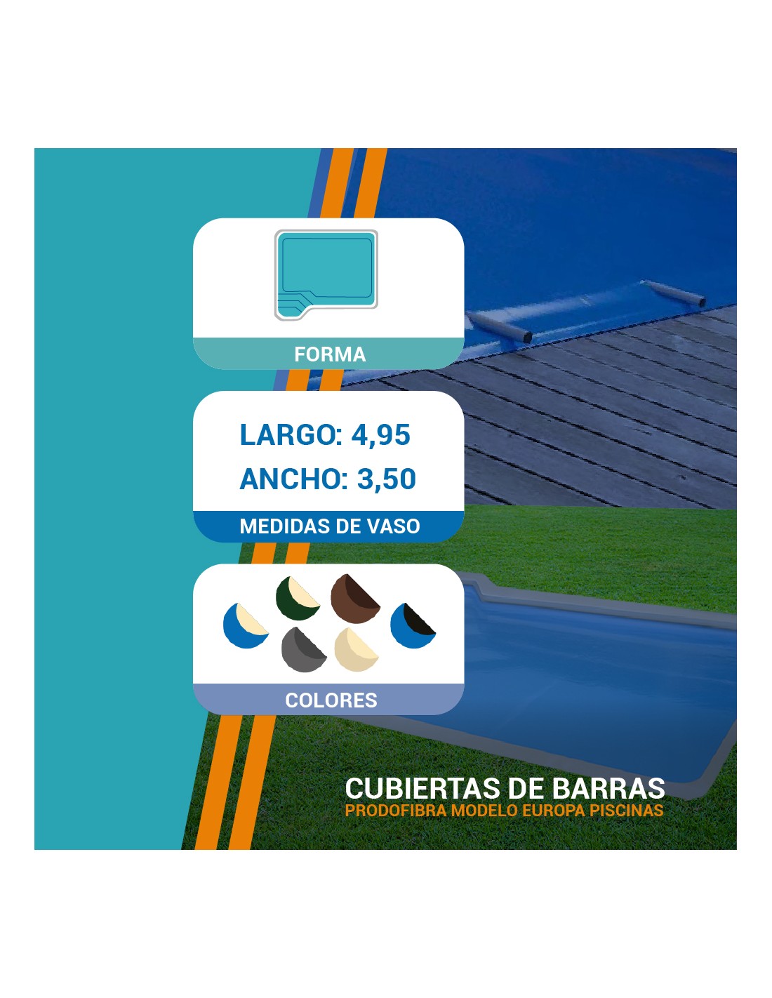 Cobertor de barras: válido para todo el año, con barras de aluminio que soportan hasta 80 kg, ofreciendo máxima seguridad. Dispone de refuerzo perimetral y drenajes para un uso cómodo y duradero.