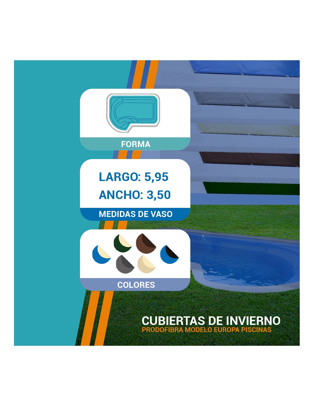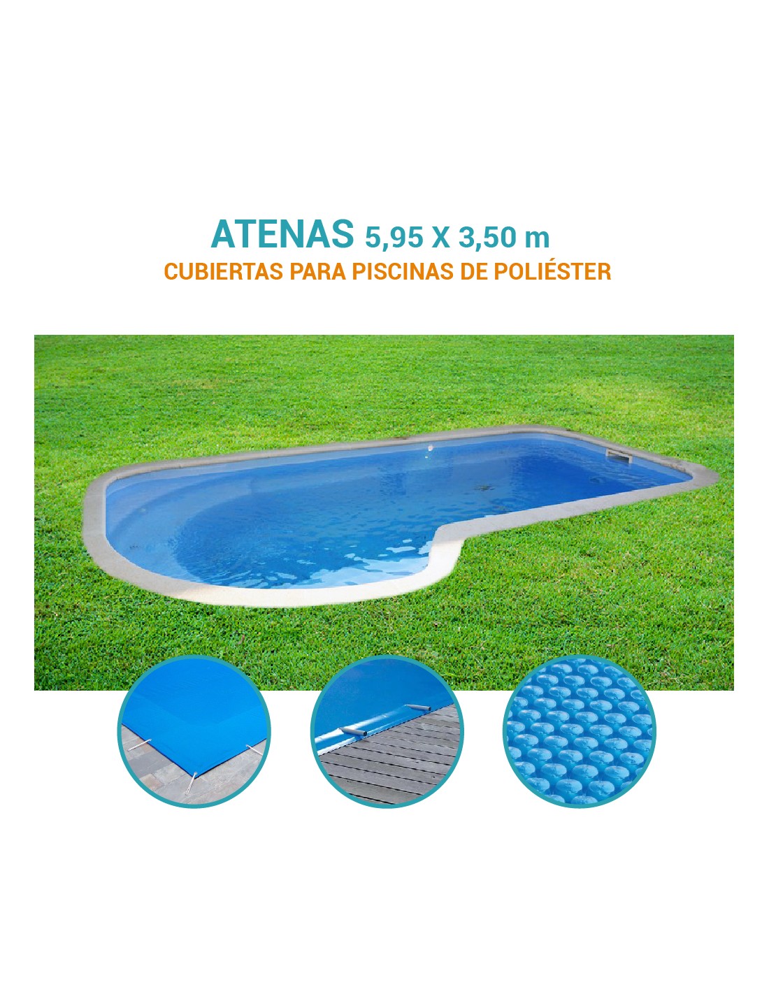 En Piscihogar fabricamos a medida diferentes cubiertas para la piscina de poliéster Atenas de 5,95x3,50 m, fabricada por Europa Piscinas. Nuestras soluciones permiten mantener tu piscina en perfecto estado durante todo el año: