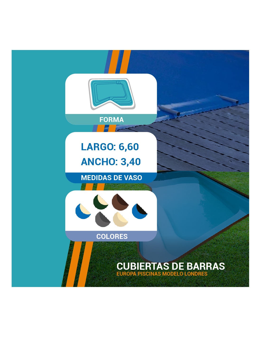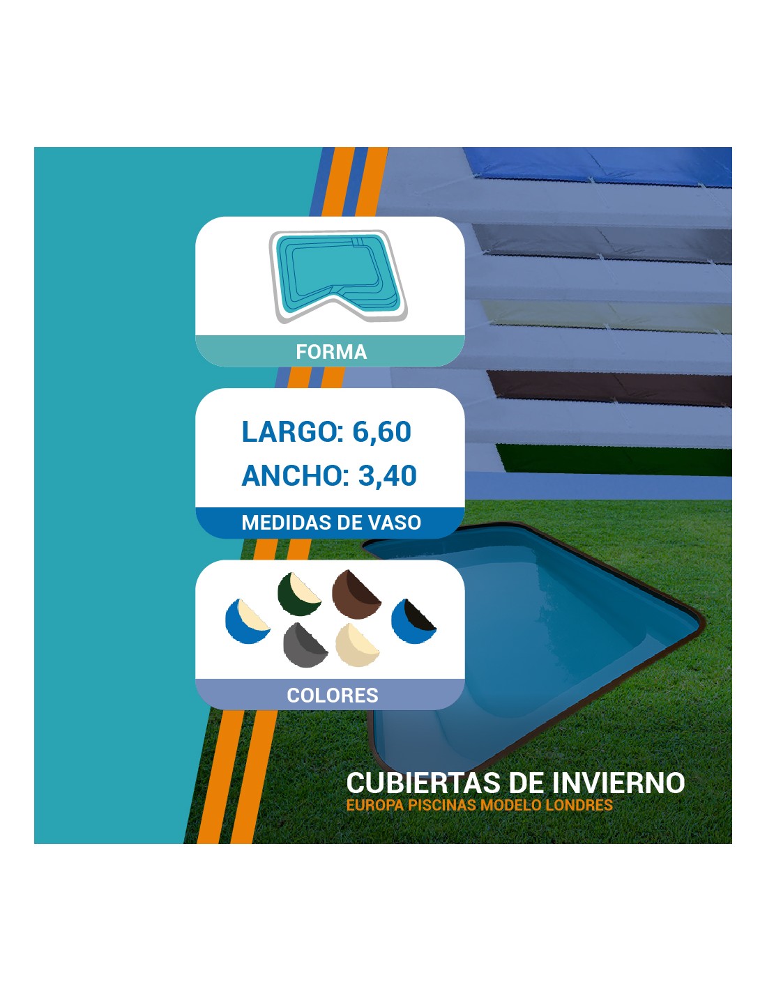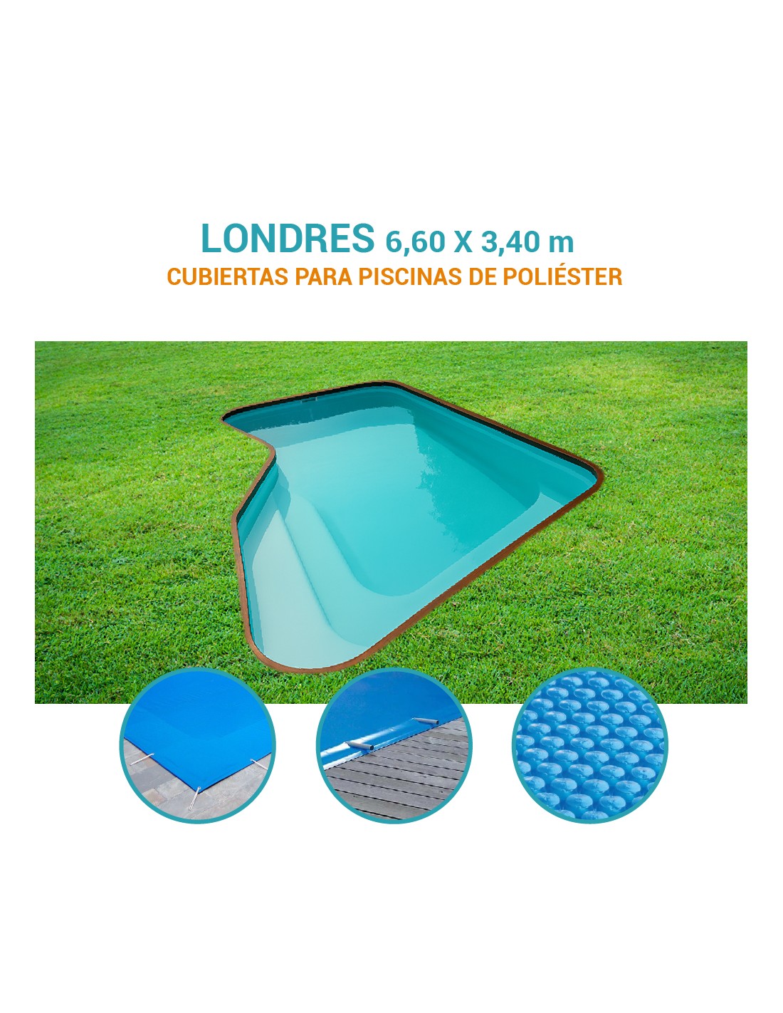 En Piscihogar fabricamos a medida diferentes cubiertas para la piscina de poliéster Londres de 6,60x3,40 m, fabricada por Europa Piscinas. Nuestras soluciones permiten mantener tu piscina en perfecto estado durante todo el año: