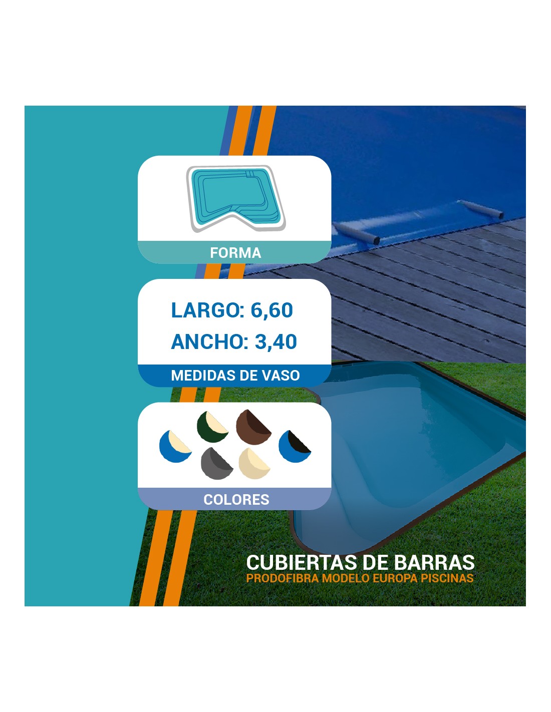 Cobertor de barras: válido para todo el año, con barras de aluminio que soportan hasta 80 kg, ofreciendo máxima seguridad. Dispone de refuerzo perimetral y drenajes para un uso cómodo y duradero.