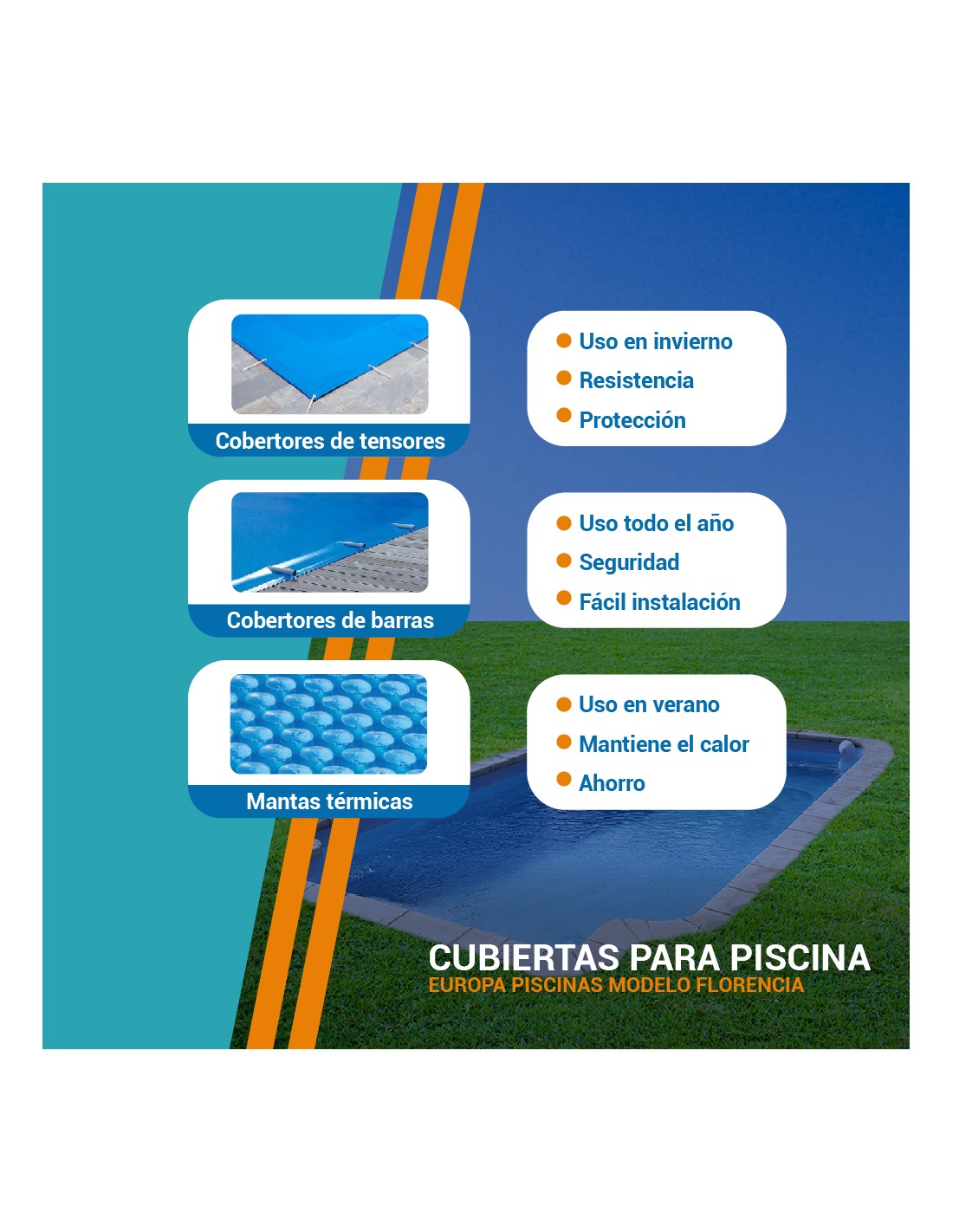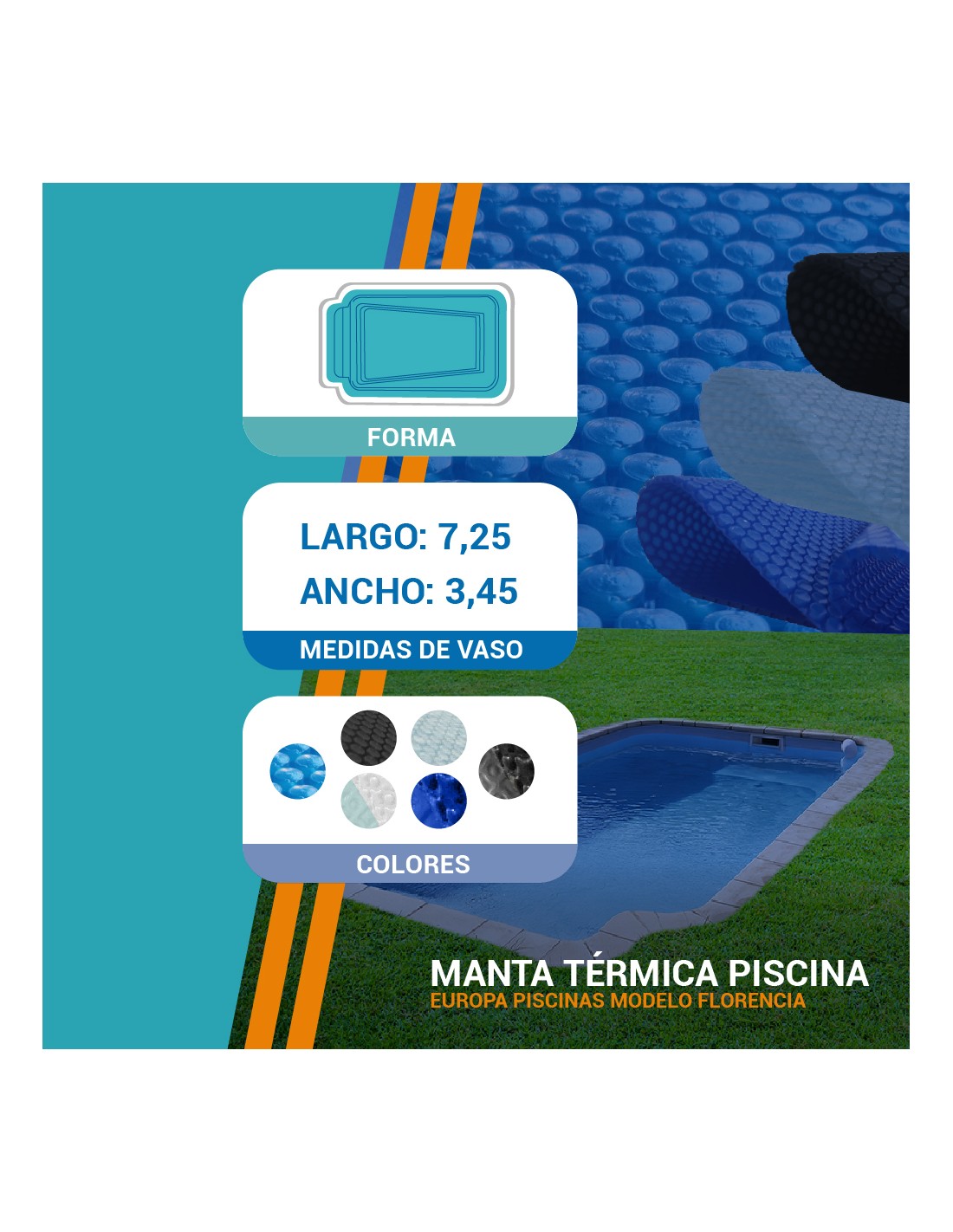 Manta térmica de verano: se coloca sobre la superficie con las burbujas hacia abajo, ayuda a conservar la temperatura que aporta el sol, reduce la evaporación y el consumo de productos químicos, además de impedir la caída de suciedad al agua.