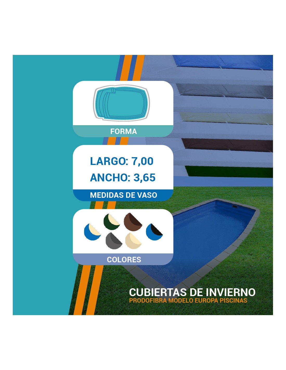 En Piscihogar fabricamos a medida diferentes cubiertas para la piscina de poliéster DX-7 de 7,00x3,65m, fabricada por Europa Piscinas. Nuestras soluciones permiten mantener tu piscina en perfecto estado durante todo el año: