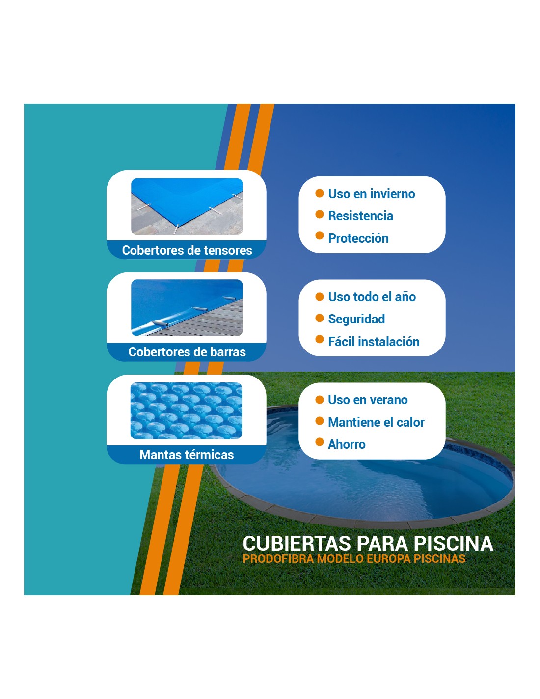 Manta térmica de verano: se coloca sobre la superficie con las burbujas hacia abajo, ayuda a conservar la temperatura que aporta el sol, reduce la evaporación y el consumo de productos químicos, además de impedir la caída de suciedad al agua.