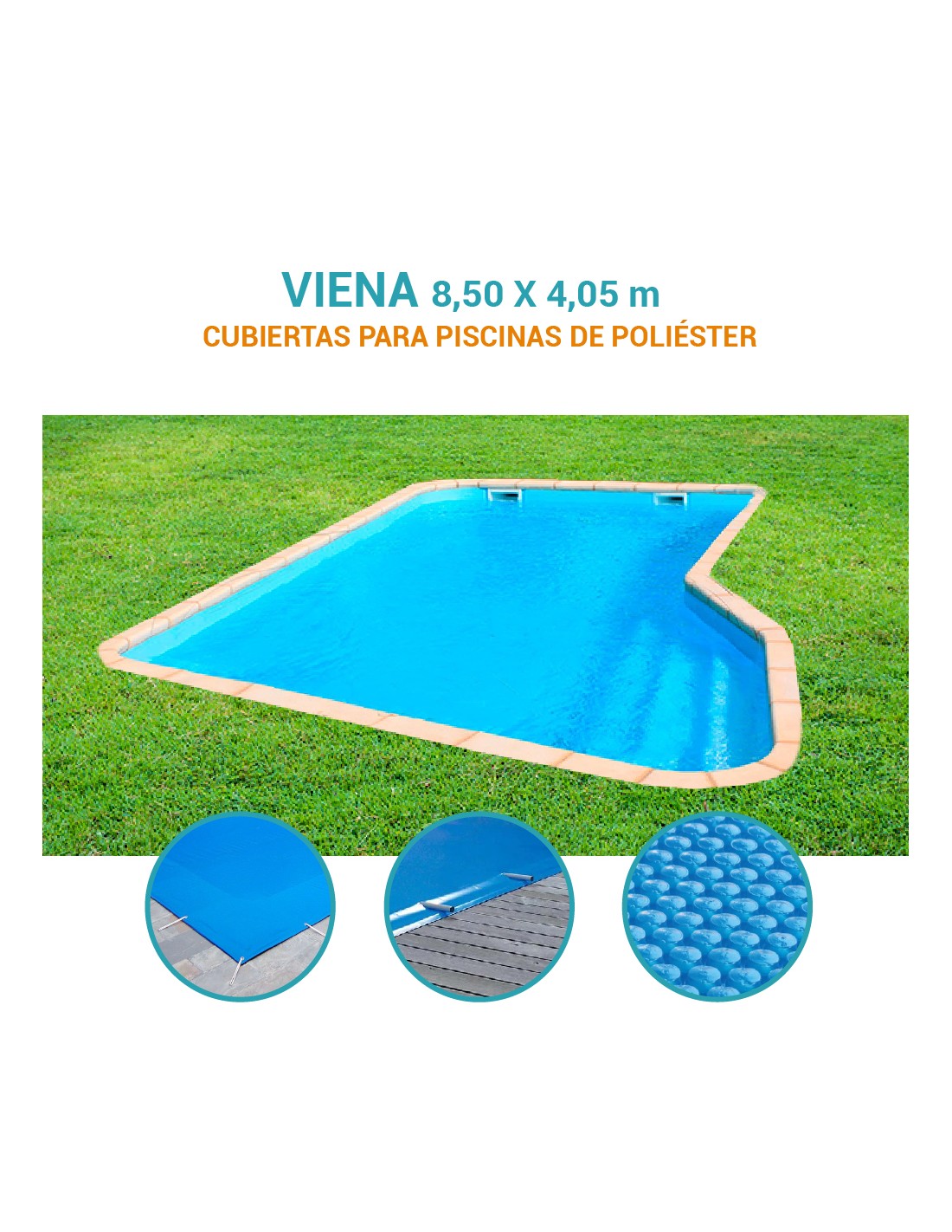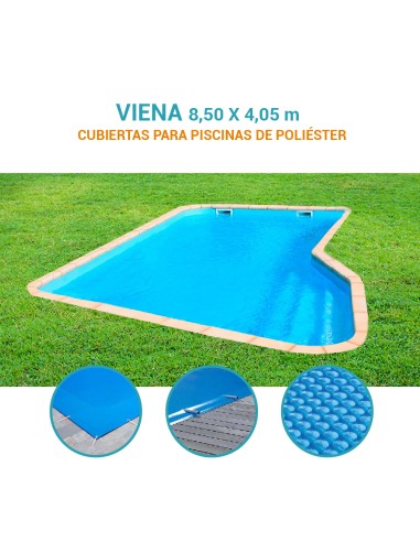 En Piscihogar fabricamos a medida diferentes cubiertas para la piscina de poliéster Viena de 8,50 x 4,05 m, fabricada por Europa Piscinas. Nuestras soluciones permiten mantener tu piscina en perfecto estado durante todo el año:
