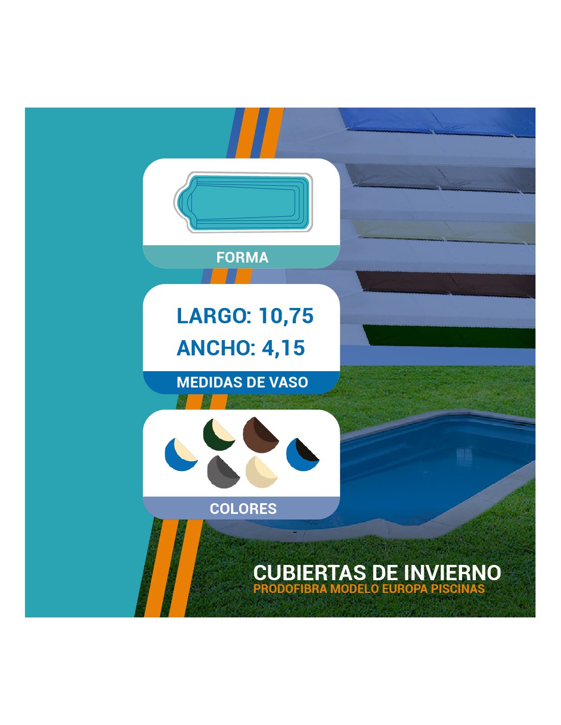 En Piscihogar fabricamos a medida diferentes cubiertas para la piscina de poliéster S1070R de 10,75 x 4,15 m, fabricada por Europa Piscinas. Nuestras soluciones permiten mantener tu piscina en perfecto estado durante todo el año: