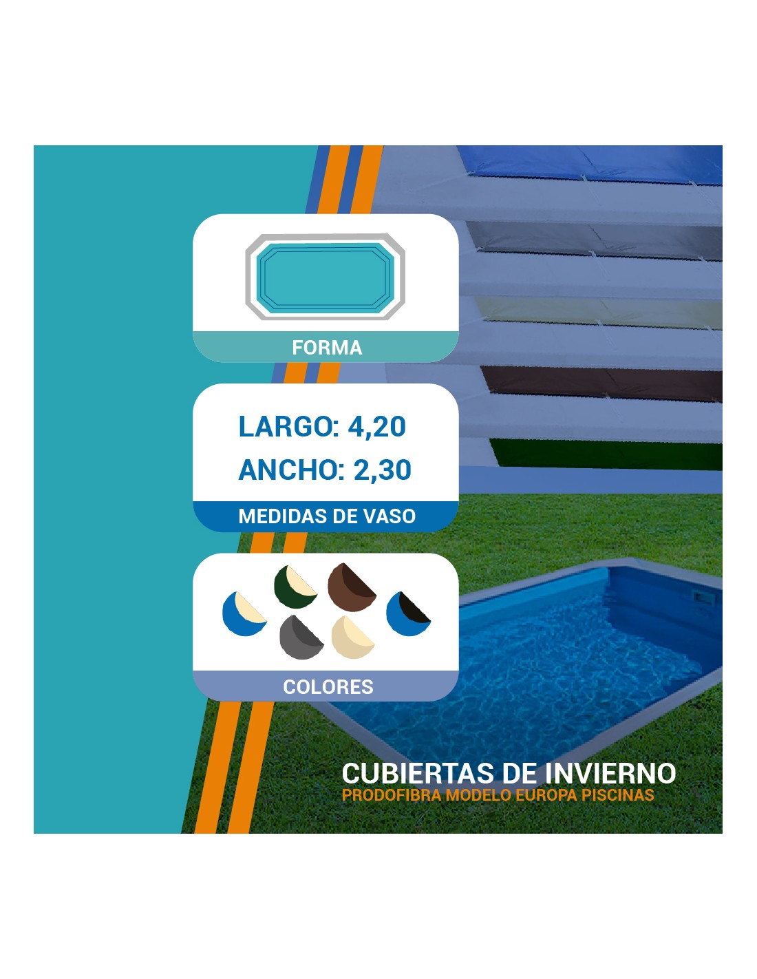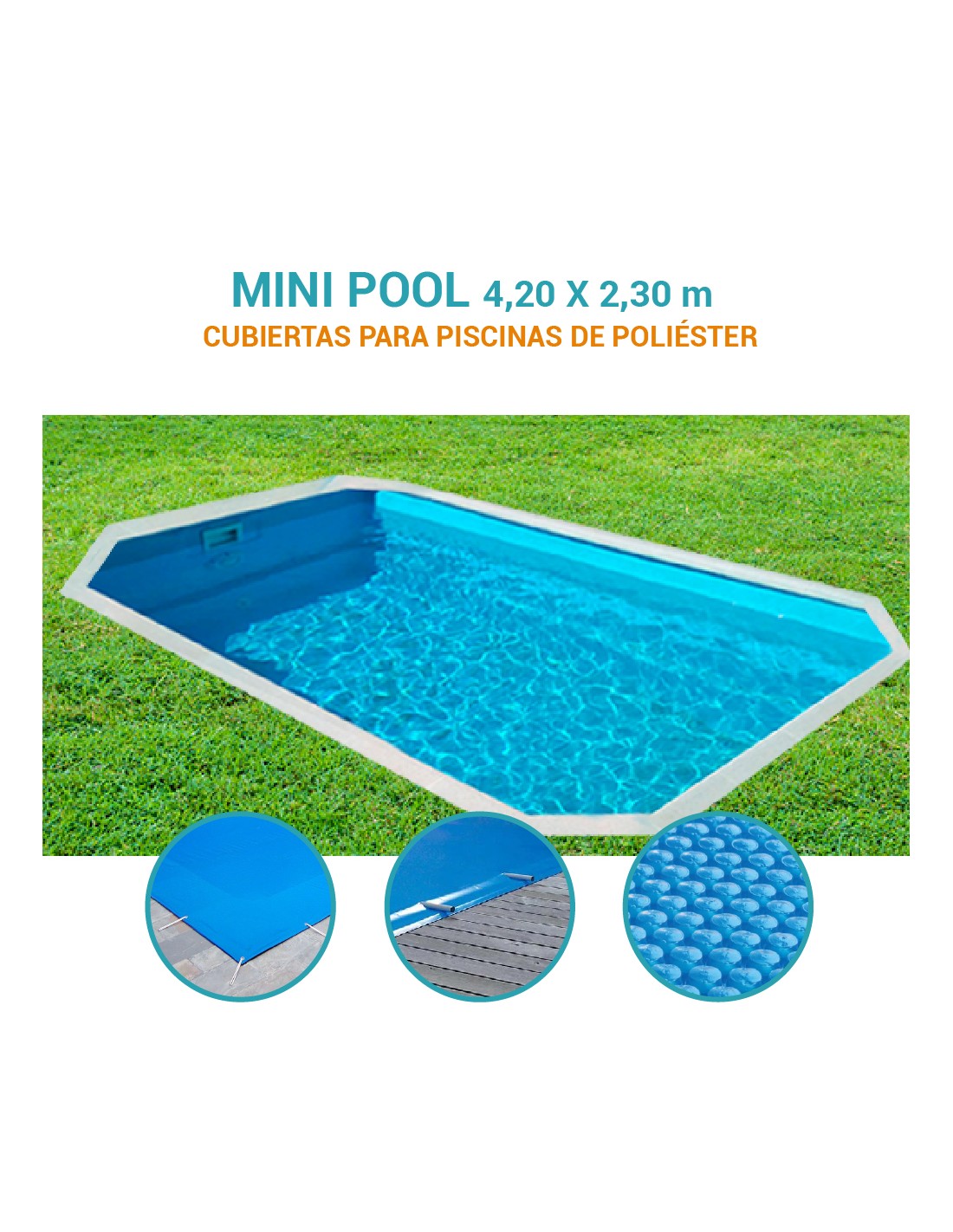 En Piscihogar fabricamos a medida diferentes cubiertas para la piscina de poliéster Mini pool de 4,20x2,30 m, fabricada por Europa Piscinas. Nuestras soluciones permiten mantener tu piscina en perfecto estado durante todo el año: