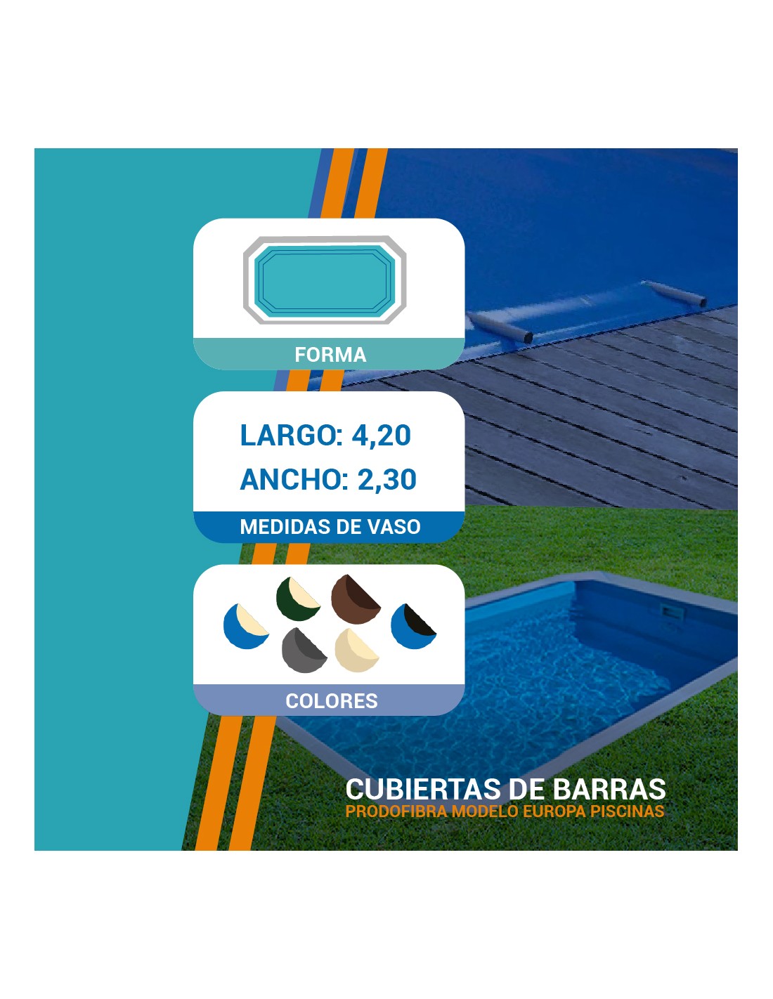 Cobertor de barras: válido para todo el año, con barras de aluminio que soportan hasta 80 kg, ofreciendo máxima seguridad. Dispone de refuerzo perimetral y drenajes para un uso cómodo y duradero.