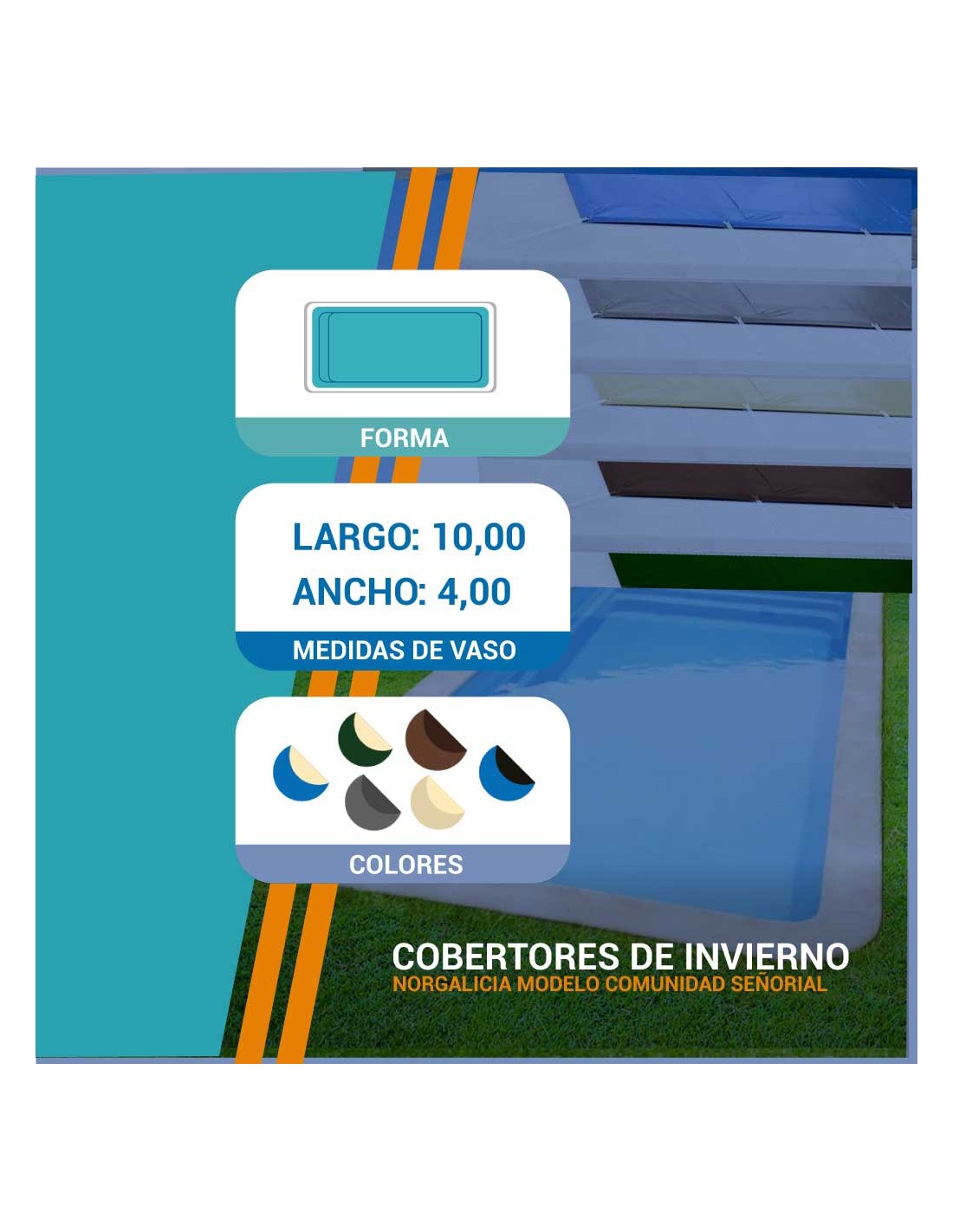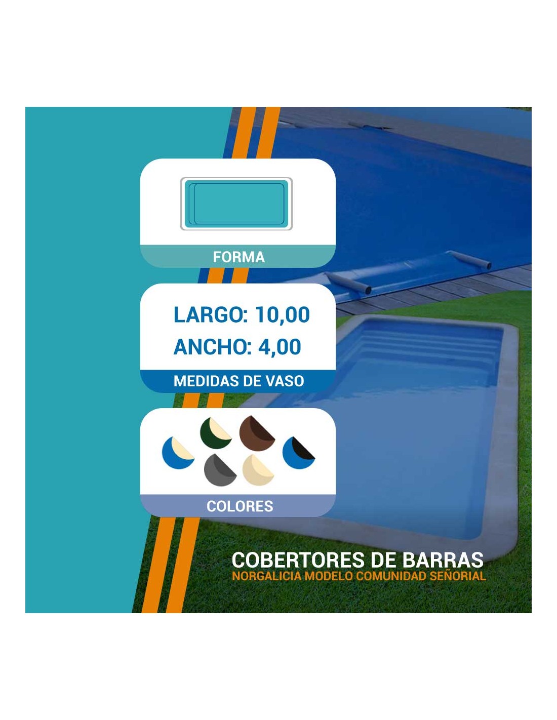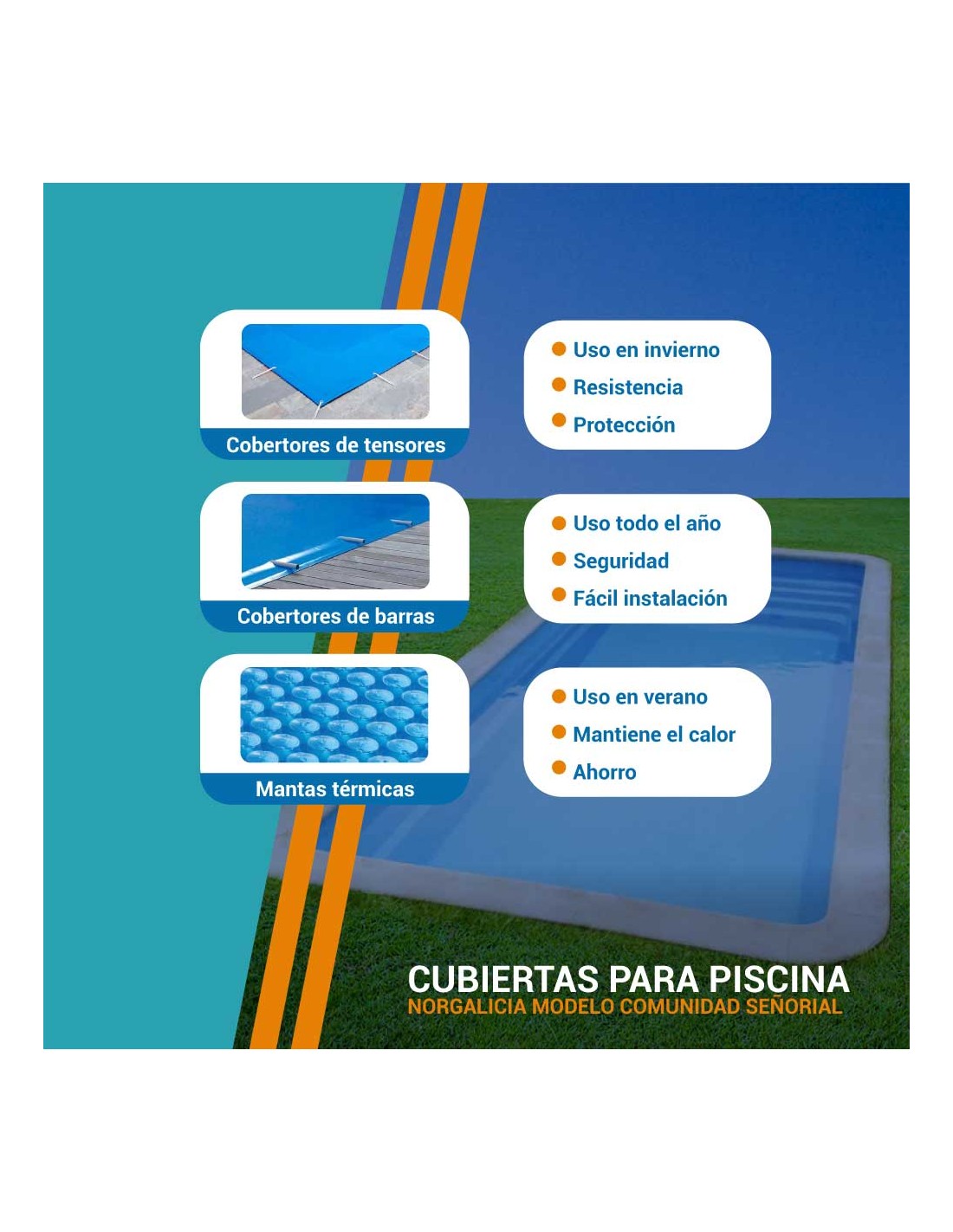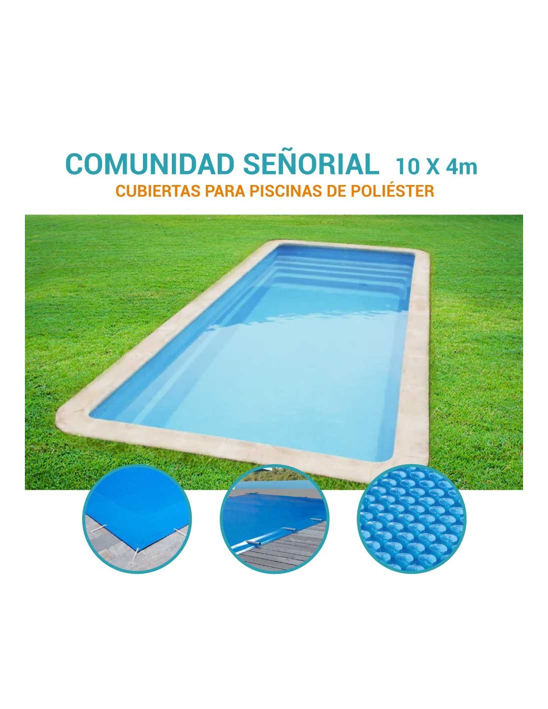 En Piscihogar fabricamos a medida diferentes cubiertas para la piscina de poliéster Comunidad Señorial de 4 x 10 m, fabricada por Norgalicia. Nuestras soluciones permiten mantener tu piscina en perfecto estado durante todo el año: