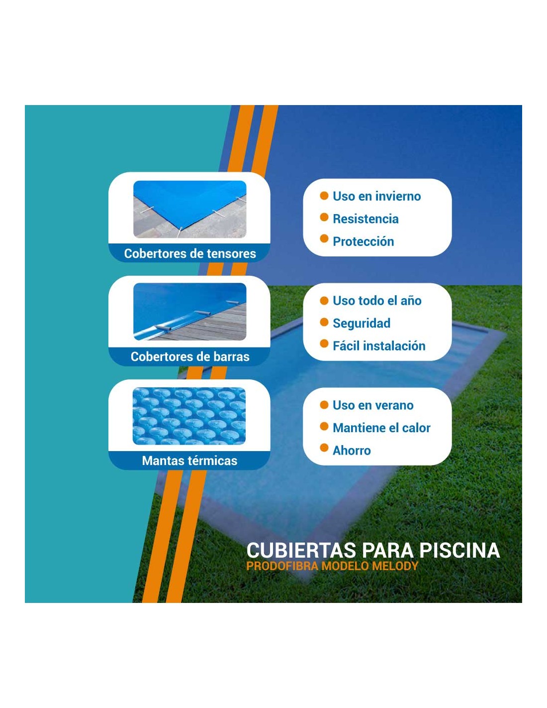 Manta térmica de verano: se coloca sobre la superficie con las burbujas hacia abajo, ayuda a conservar la temperatura que aporta el sol, reduce la evaporación y el consumo de productos químicos, además de impedir la caída de suciedad al agua.