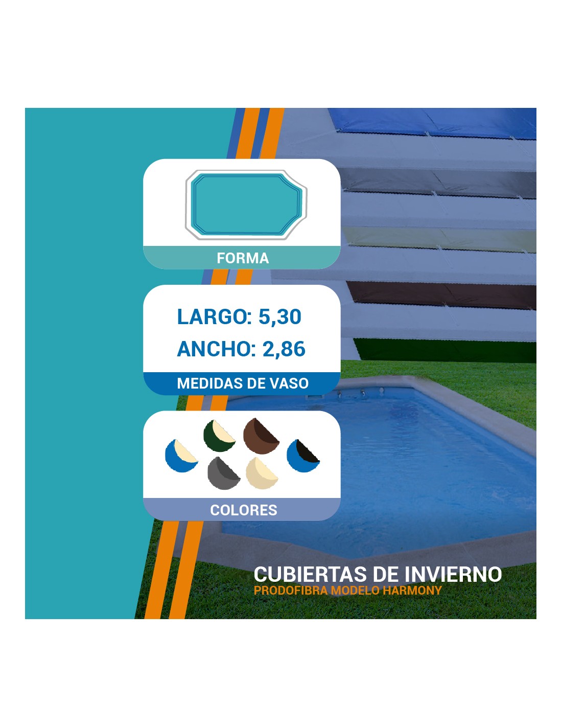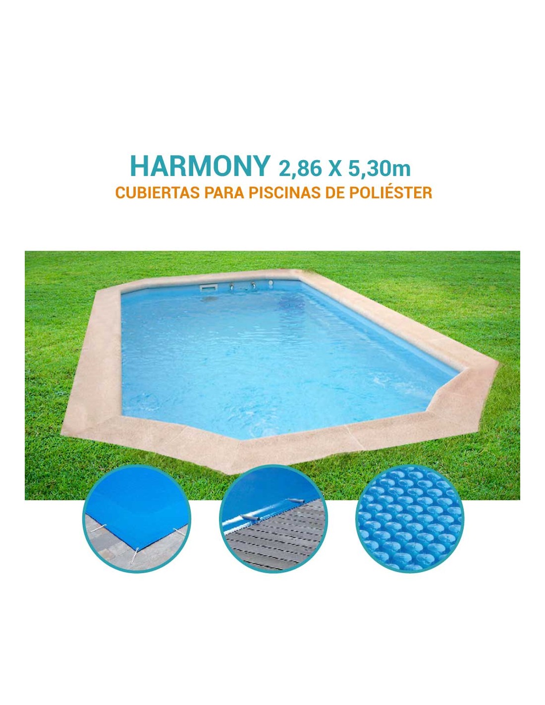 En Piscihogar fabricamos a medida diferentes cubiertas para la piscina de poliéster Harmony 2 de 2,86x5,30 m, fabricada por Prodofibra. Nuestras soluciones permiten mantener tu piscina en perfecto estado durante todo el año: