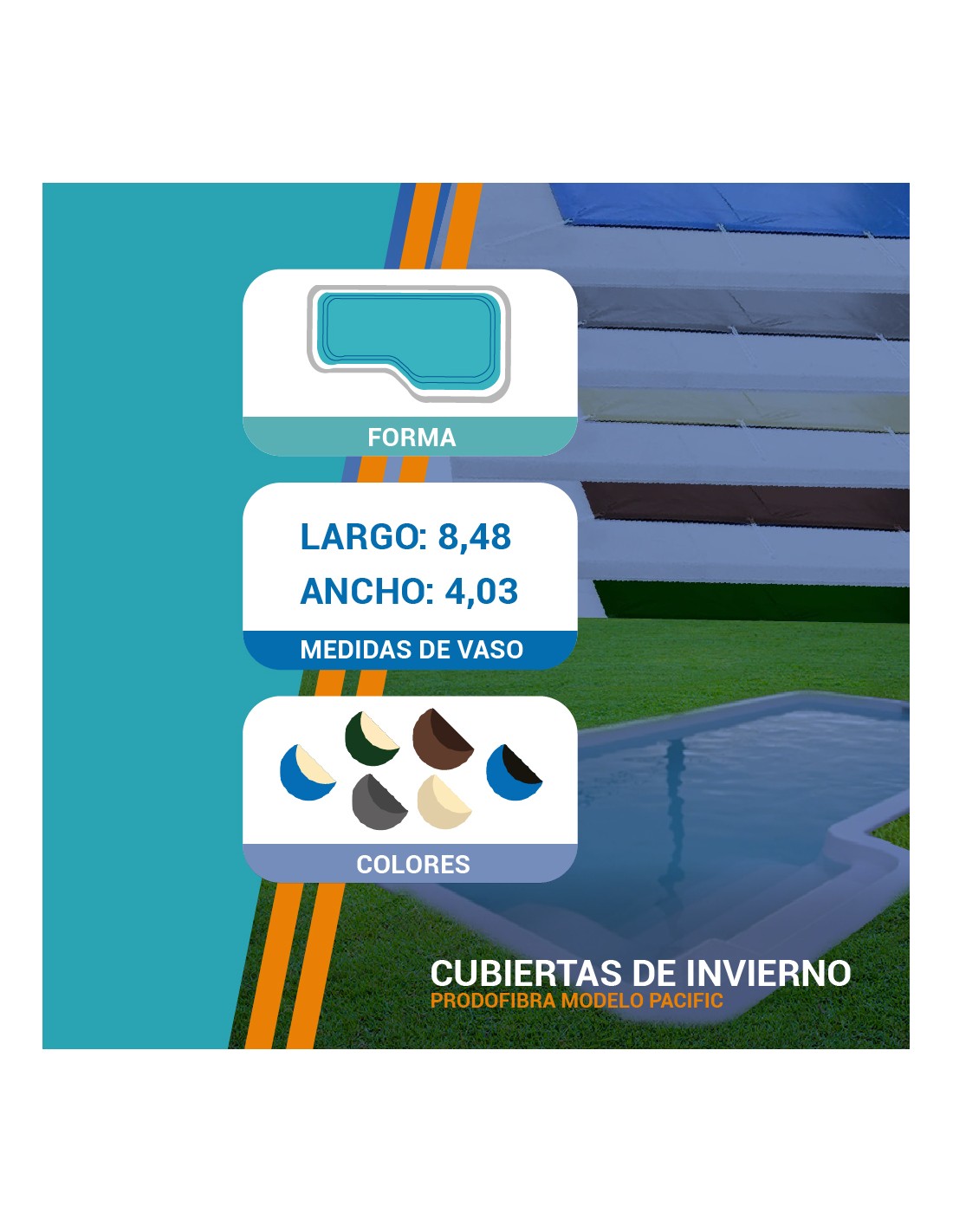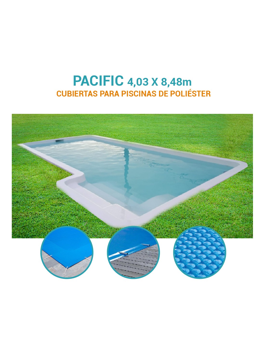 En Piscihogar fabricamos a medida diferentes cubiertas para la piscina de poliéster Pacific 8,50 de 4,03x8,48 m, fabricada por Prodofibra. Nuestras soluciones permiten mantener tu piscina en perfecto estado durante todo el año: